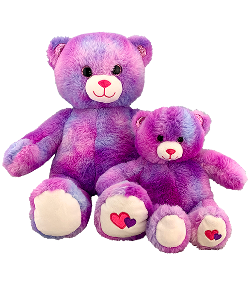 Amore the bear has beautiful pink and purple fur, with glitter accents, big sparkle eyes, and embroidered hearts on her foot. Show some love! Amore has plastic eyes!