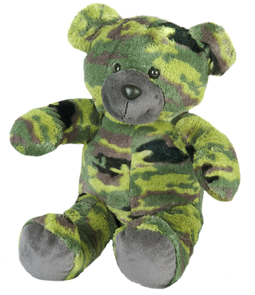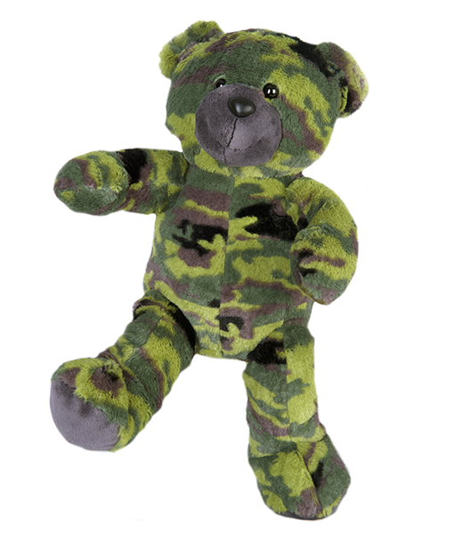 “G.I.” Camo Bear (16″). This bear has plastic eyes.