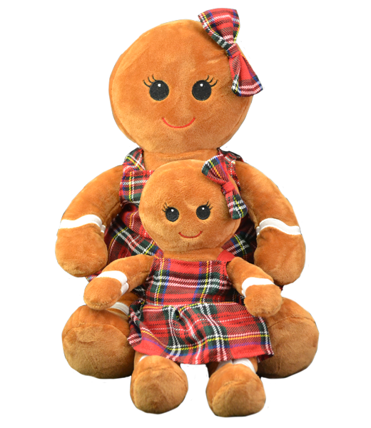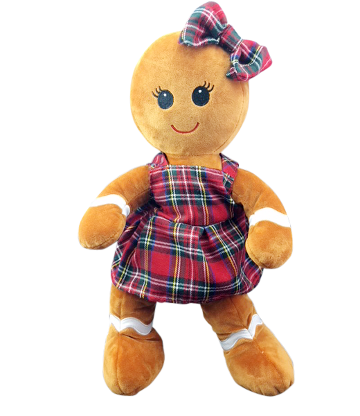 This little gingerbread girl comes wearing a festive plaid jumper, and bow in her “hair”. She’s sure to make you smile. Ginger and Snap make a great pair! Ginger has embroidered eyes.