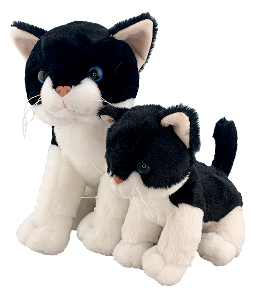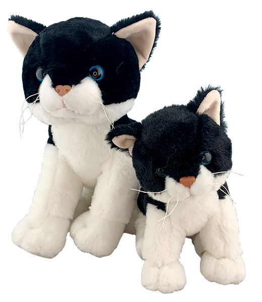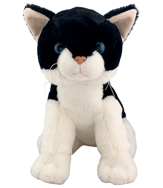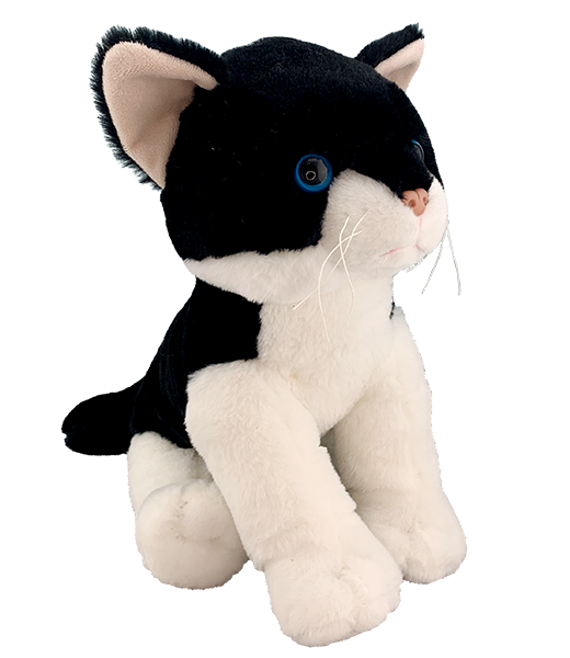 This black and white kitty has super soft and cuddly fur and just begs for a hug. This kitty has plastic eyes!